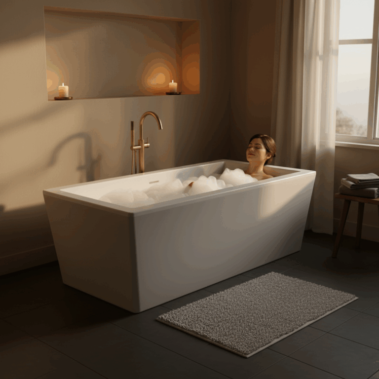 Relax in this beautiful large alcove style soaker bathtubs include lumbar support, arm rests, and an integral skirt.